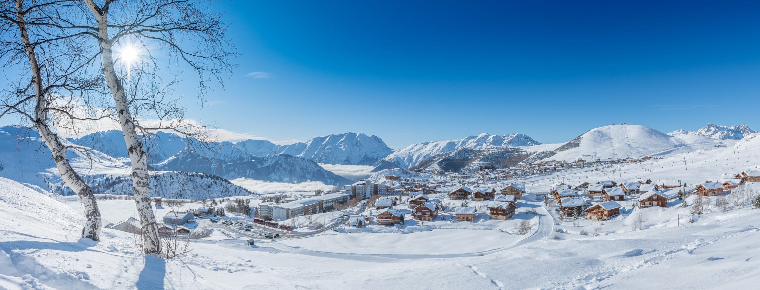 De ses 3330 mètres d’altitude desservis par un téléphérique aérien, le Pic Blanc domine les 250 km de pistes qui plongent jusqu’aux villages de Vaujany (1250m), Oz-en-Oisans (1350m), Villard-Reculas (1450m), Huez (1500m) et Auris-en-Oisans (1600m).